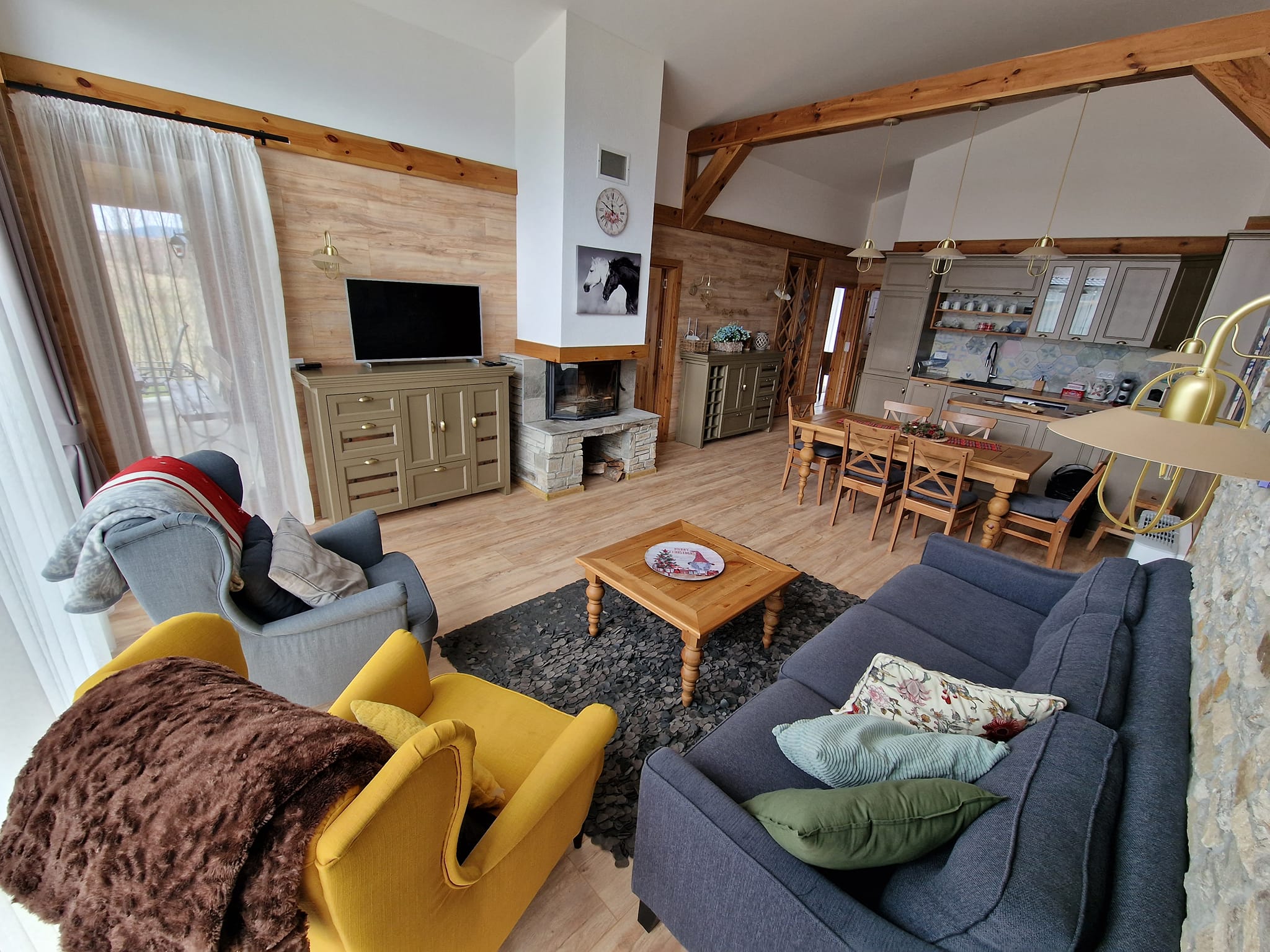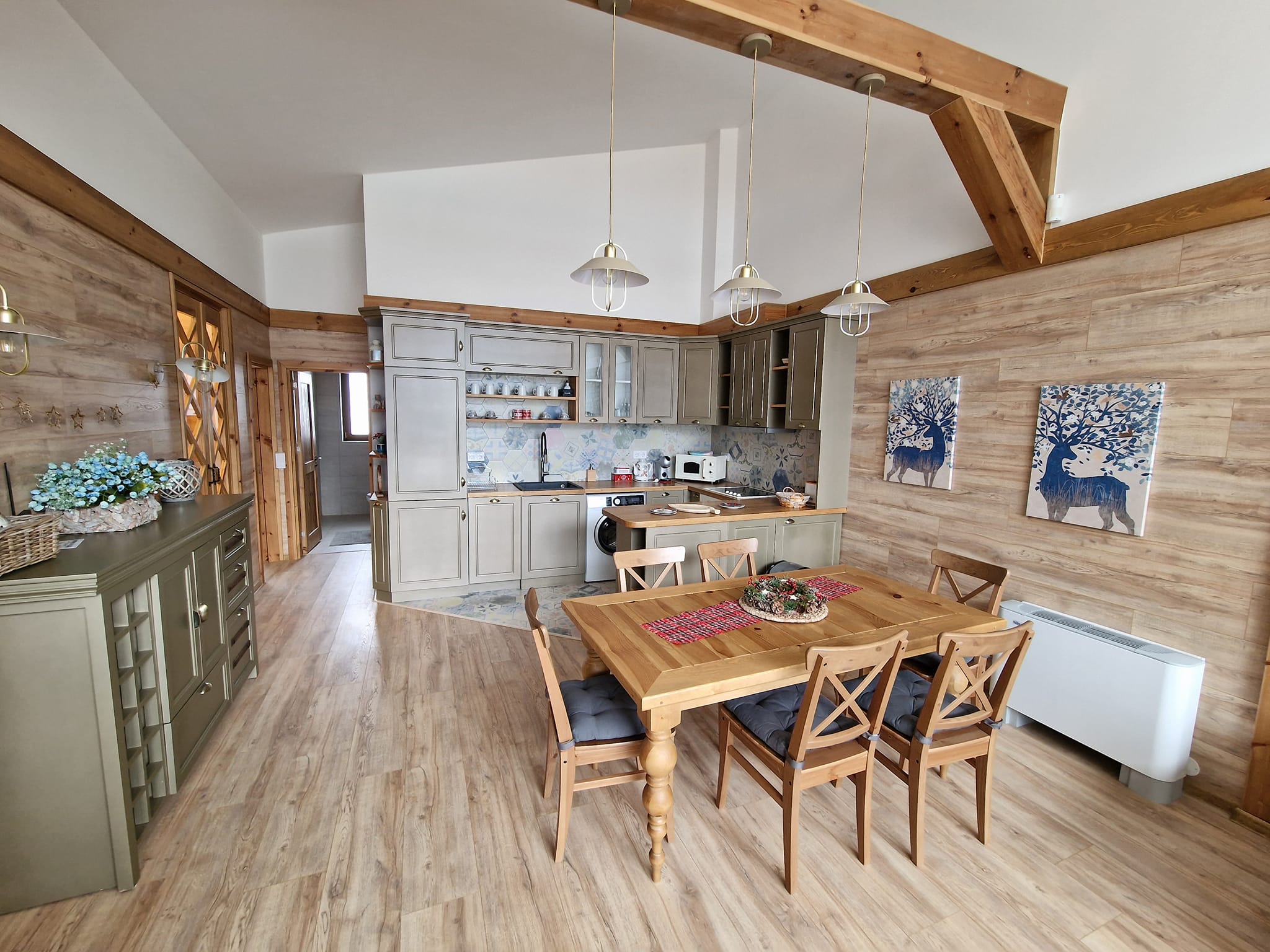 Къщата е със застроена площ от 104.09 кв.м., изключително топла и уютна, построена е с висококачествени материали. Височина на таваните 5 метра. Отвън имотът е изолиран изцяло по съвременните изисквания и е облицован с камък и дърво, което го прави прохладен през лятото и топъл през зимните месеци. Вилата разполага със собствен паркинг.
