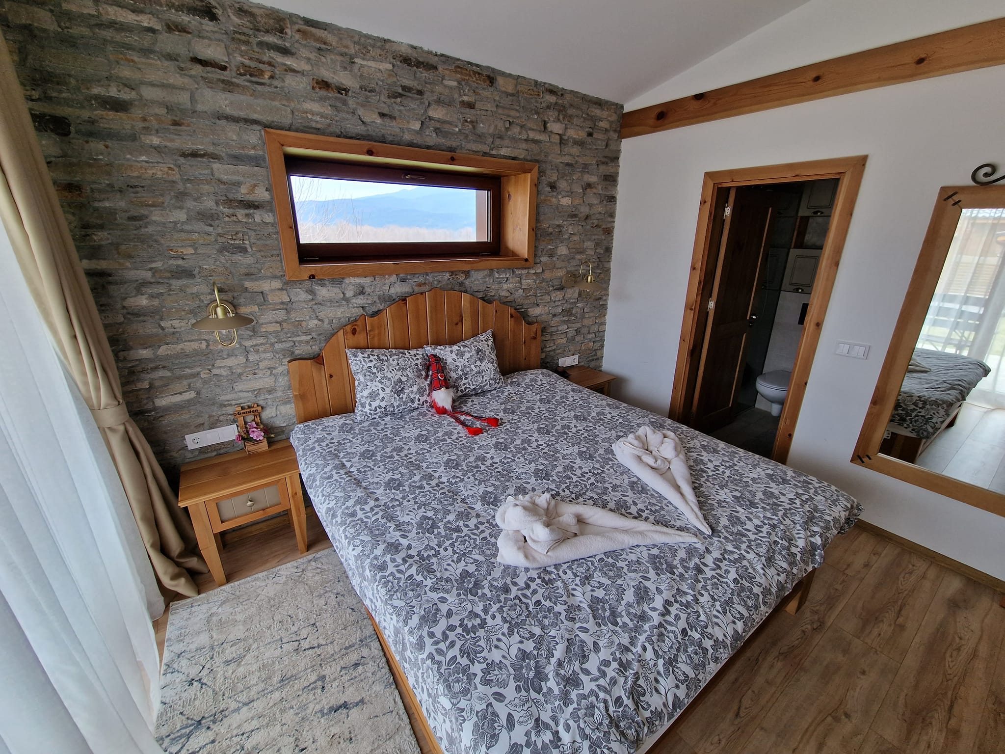 Разпределение на помещенията: входно антре със сауна, просторна дневна с камина, трапезарна част и кухненски бокс, три спални, едната е мастър бедрум с баня и тоалетна към нея, втора баня с тоалетна, веранда с барбекю и голям двор 215 кв.м. От верандата и дневната на къщата се открива прекрасна гледка към Пирин планина.