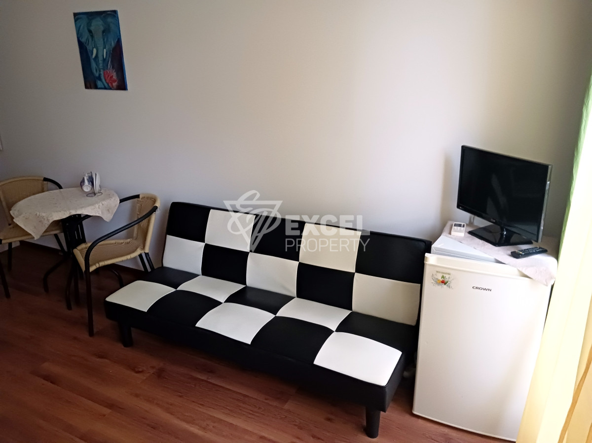 Ексел Пропърти предлага за продажба едностаен имот-студио, разположено на партера, с обща площ от 25,95 м2 в жилищен комплекс Съни Дей 6. Състои се от входно антре, 2 разтегателни дивана, вградена кухня, с необходимите уреди, има хладилник, шкаф, телевизия, пералня и оборудвана баня с бойлер, душ, огледало и WC.Предлага гледка към басейна, няма тераса. Идеално предложение за лятната Ви почивка. Удобствата, които предлага комплекса са всичко, от което имате нужда за една незабравима лятна ваканция. Те включват: целогодишно обслужване; 5 басейна (басейни за възрастни, детски басейни, басейн с бар), озеленена и поддържана територия, 2 мини-голфа, детска площадка, тенис корт, баскетболно и футболно игрище, контролиран достъп, видео-наблюдение, паркинг, има и ресторант през летния период. Таксата за обслужване е в размер на 580 Евро на година. Акт 16- има.