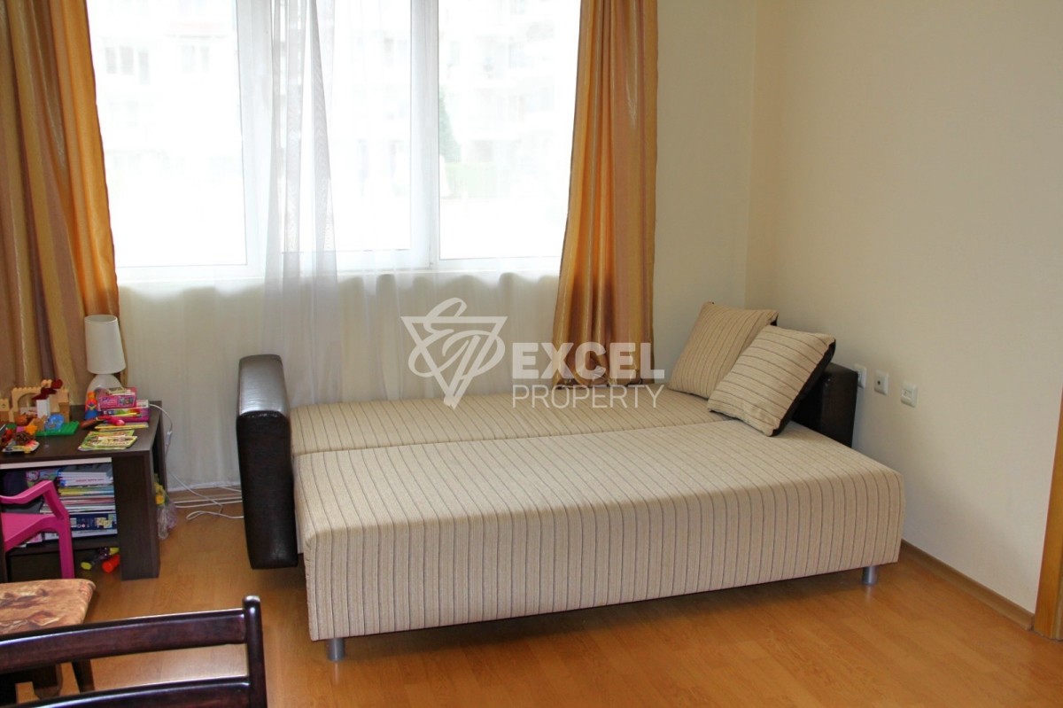 Ексел Пропърти предлага за продажба двустаен апартамент на партера с обща площ от 50 кв.м. Имота е за продажба напълно обзаведен и разполага с всекидневна с кухненски бокс, баня с душ кабина, спалня и балкон. Кухнята е снабдена с котлони, аспиратор, хладилник и микровълнова. Ще намерите още диван, масичка за кафе, маса за хранене с четири стола и ТВ шкаф с телевизор. Банята е напълно оборудвана, там е монтирана пералнята, на разположение е един климатик във всекидневната. Терасата е с много добър размер има западно изложение, директен достъп до басейна. Имота е в отлично състояние и е готов да посрещне новите си собственици.