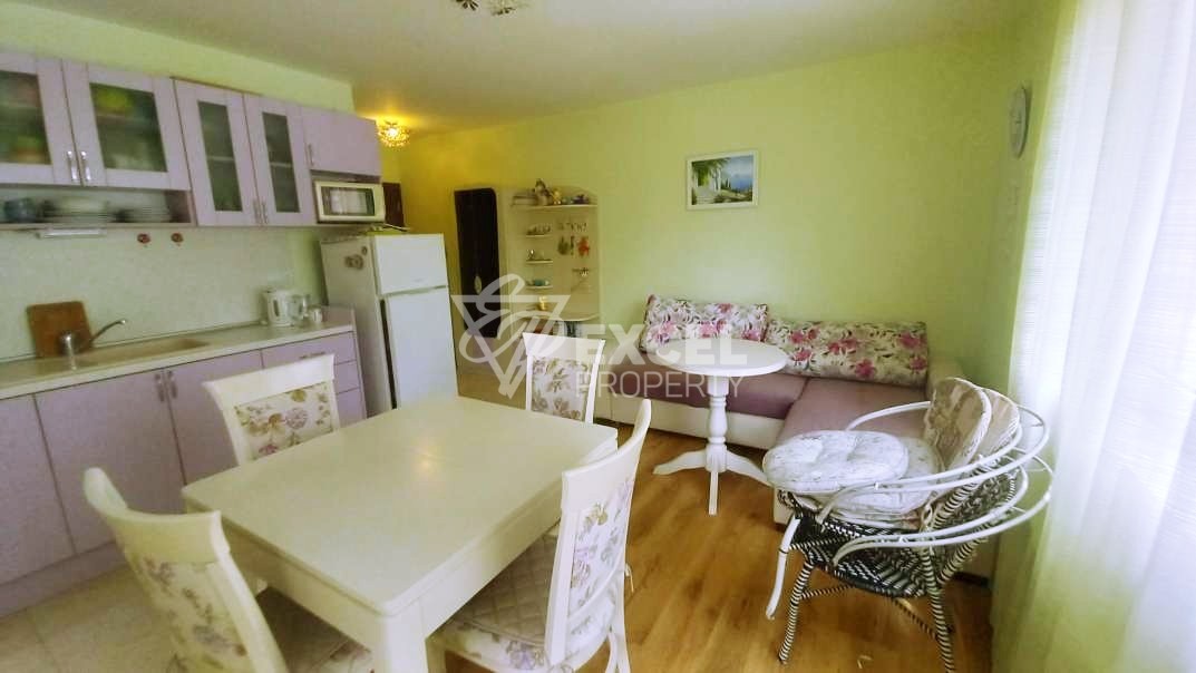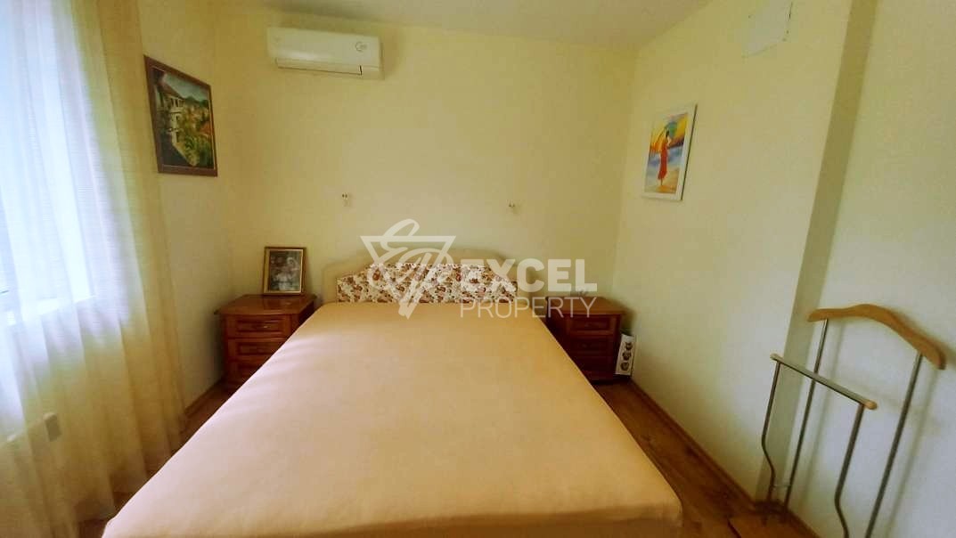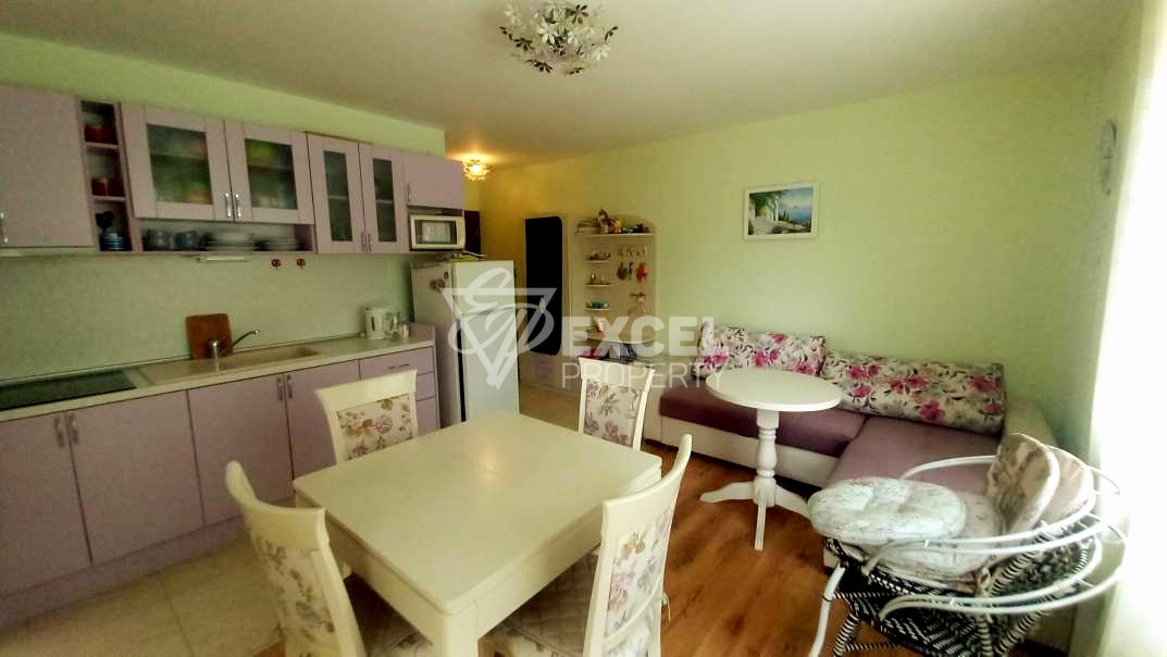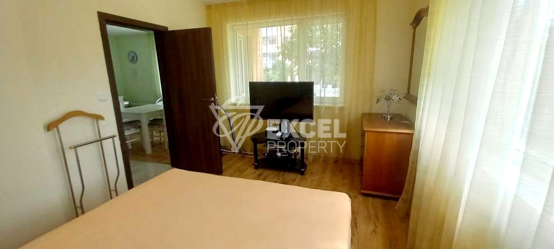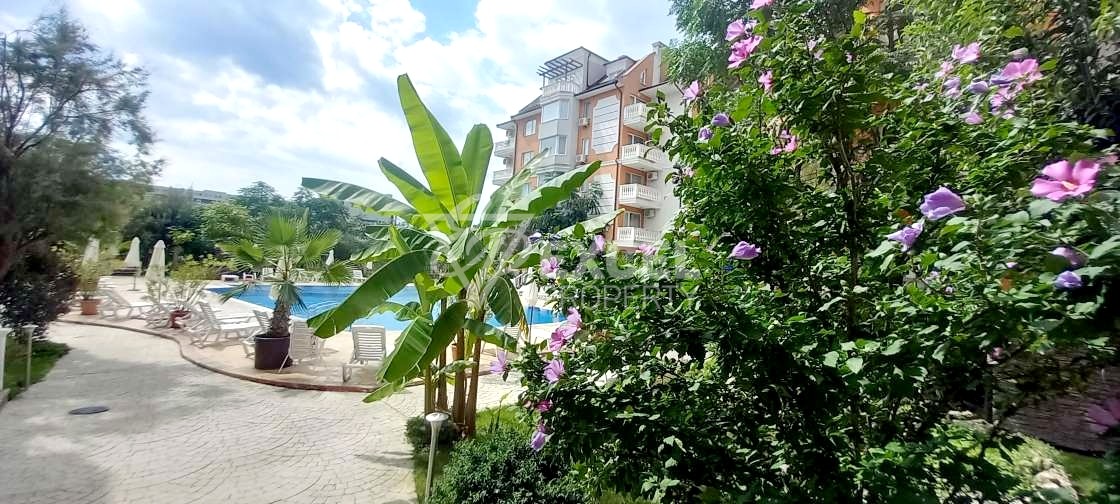 Ексел Пропърти предлага за продажба двустаен апартамент - с една спалня с обща площ от 54 кв.м., разположен на първи етаж /не на земята / в модерния комплекс Сий Даймaнд, в района на Какао Бийч - Слънчев Бряг. Чиста площ-47. 51м2. Имотът се състои от входно антре, дневна с обзаведен кухненски бокс и зона за хранене, една спалня, баня с тоалетна и балкон. Терасата е достъпна от страна на всекидневната, тя предлага гледка към басейна и зелените площи на комплекса. Апартаментът е оборудван с всичко необходимо, подходящ за целогодишно живеене, лятна почивка или отдаване под наем. Има два климатика /във всяка стая/, пералня - в банята, разтегателен диван в хола и оборудвана кухня за пълноценен престой. Спалнята разполага с легло, има и ТВ и устройство за интернет. През зимния период имотът може да се отоплява, тъй като има радиатори във всяка стая + в банята.
