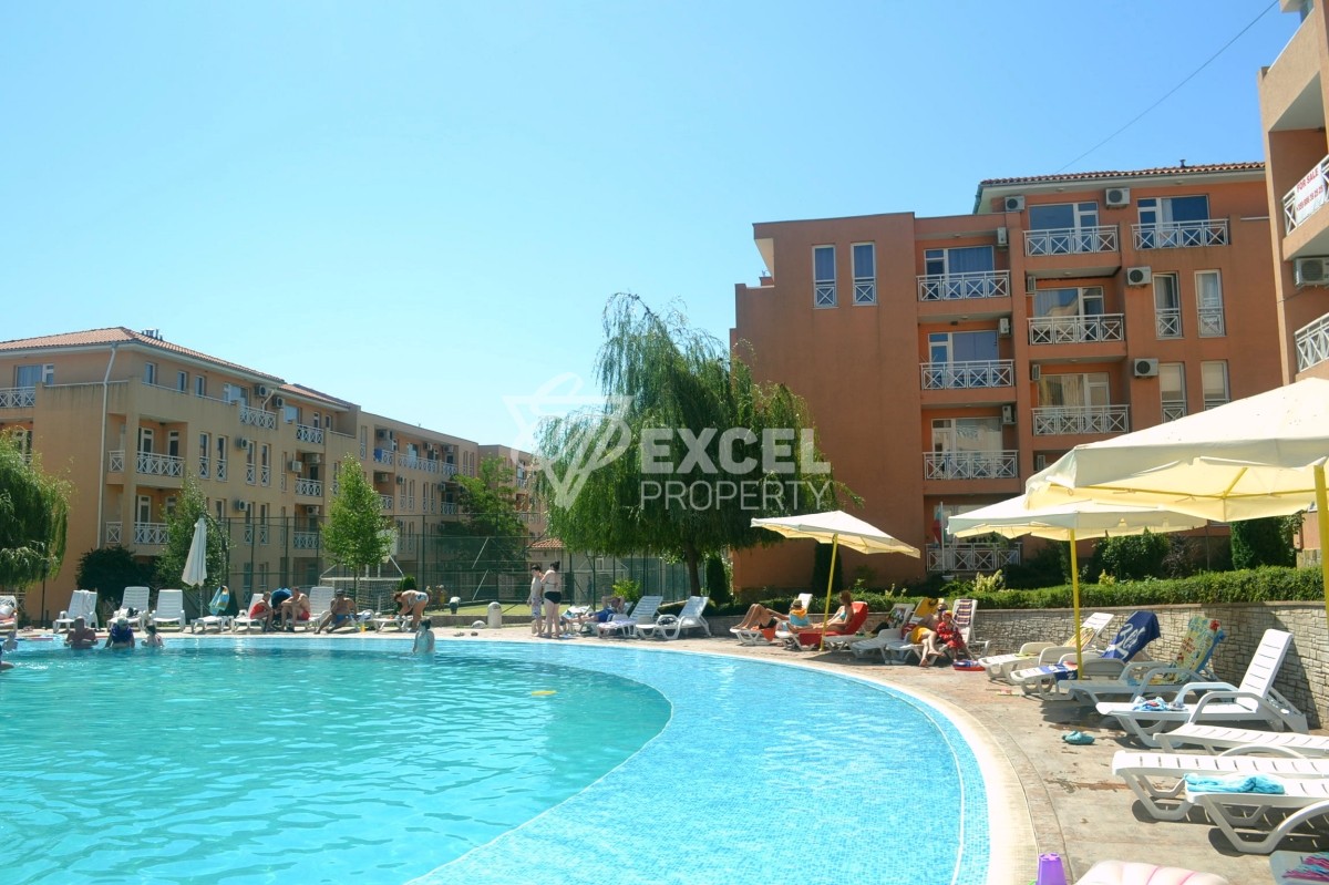 Ексел Пропърти предлага за продажба без комисионна от купувача, двустаен апартамент / с една спалня/ в затворен комплекс Съни Дей 6, недалеч от курортен комплекс Слънчев Бряг. Апартаментът се намира на 2-ри етаж от 4-ри, без асансьор. Напълно обзаведен и готов за живеене, обща площ на жилището- 42 кв.м. Имотът е в добро състояние, разполага с хол с кухненски бокс: ел. котлон, хладилник, кухненски шкафове, кана, пералня, има разтегателен диван за 2-ма човека, маса със столове- зона за хранене; баня обзаведена с мивка, бойлер и душ, както и една спалня и тераса, която е достъпна от двете стаи на апартамента. Апартаментът разполага с един климатик във всекидневната. Страхотно предложение за лятната Ви почивка, подходящ за 4 човека или семейство с деца. Ваканционният комплекс включва 46 четириетажни сгради, където са разположени 1 573 апартамента.