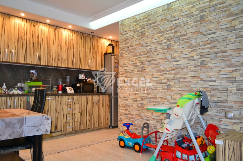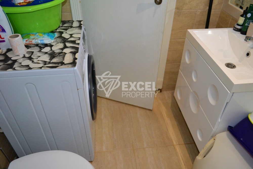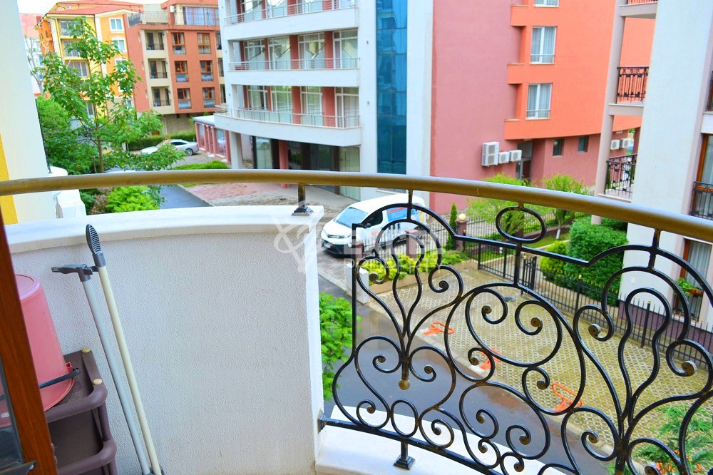 Имотът се намира на трети етаж, с източно изложение и гледка към съседните комплекси. Разполага с площ от 80 кв.м. и се предлага напълно обзаведен. Състои се от всекидневна с удобна кухня, родителска спалня, детска стая, санитарен възел и две тераси. В хола има ъглов диван, ТВ шкаф с голям телевизор, холна маса и маса за хранене с четири стола. Кухнята е оборудвана с печка, фурна, аспиратор, хладилник, съдомиялна, микровълнова и достатъчно шкафове за посуда. В спалнята ще намерите двойно легло с нощни шкафчета и гардероб. Детската стая е оборудвана с легло и комод. Балконът, на който се излиза от спалните е достатъчно голям, за да побере маса и столове. Втория балкон е с достъп от всекидневната. Банята е напълно оборудвана с душ кабина и пералня. Апартаментът разполага с климатик DAIKIN мулти сплит система за трите стаи, кабелна телевизия и интернет. За по-студените месеци има и подово отопление навсякъде в апартамента. Имотът е оборудван и се ползва за целогодишно ползване. Такса поддръжка 18 Евро/м2