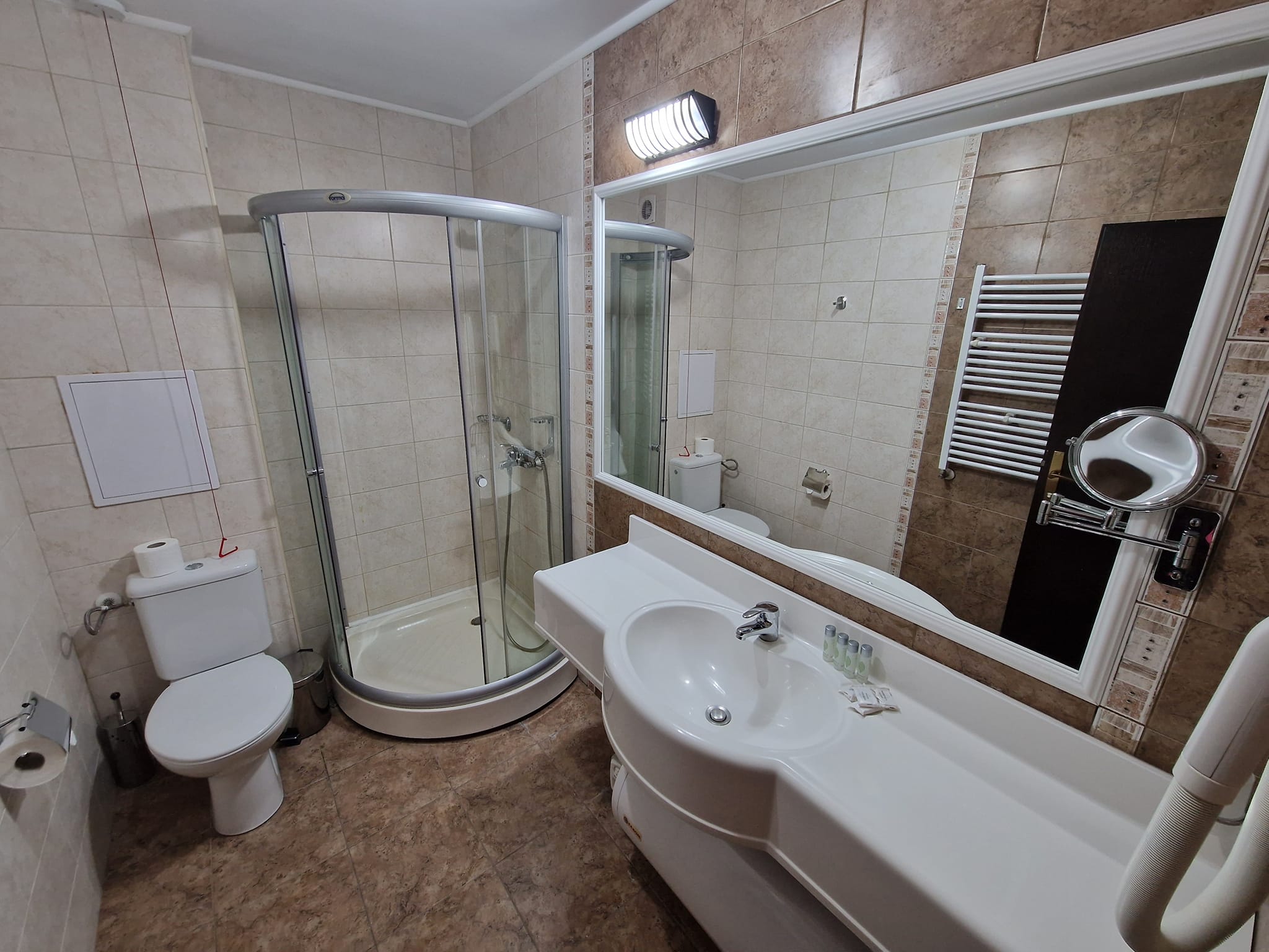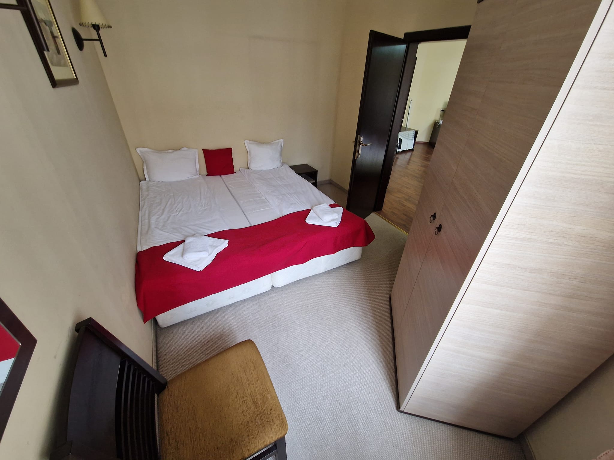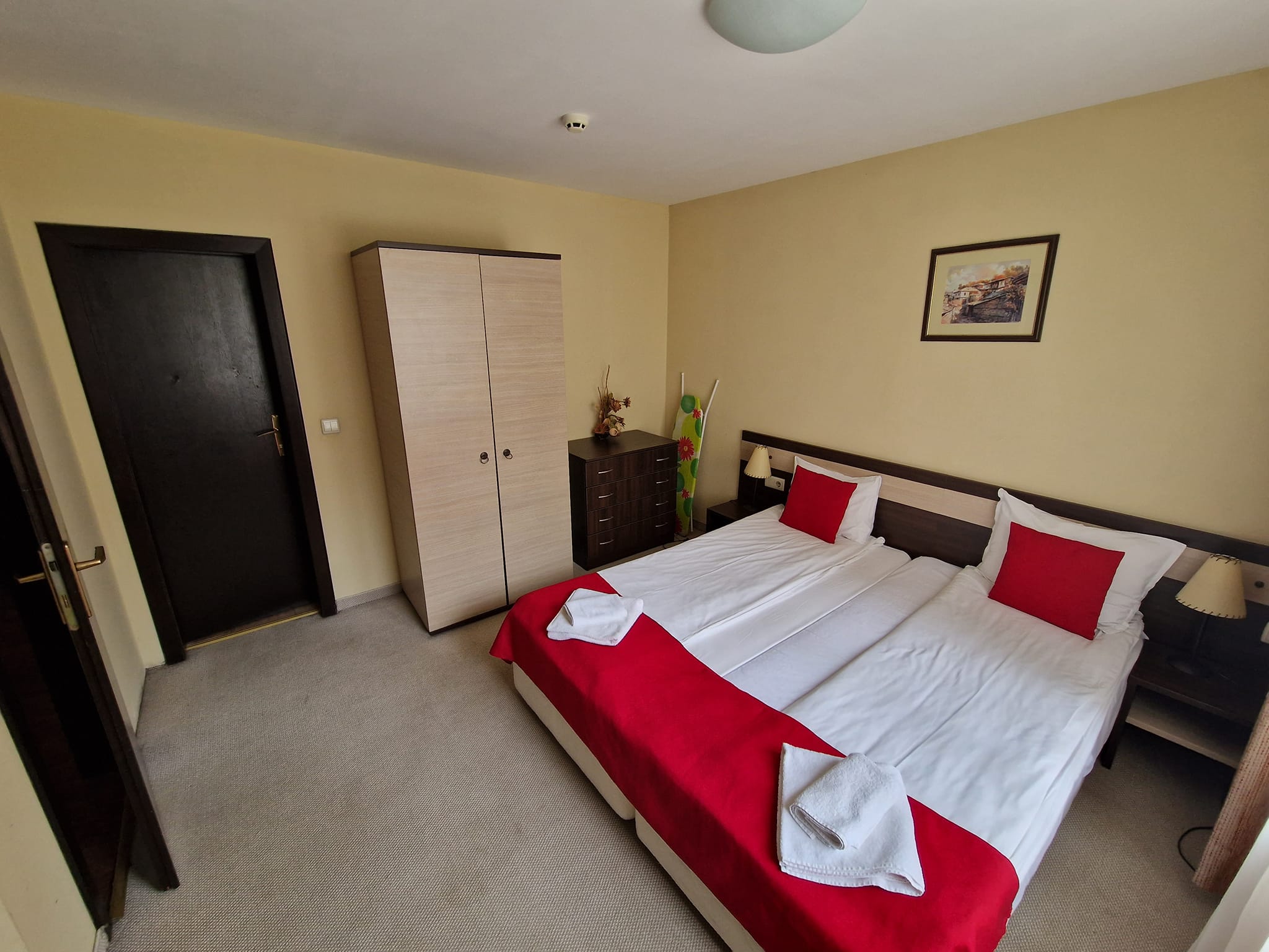 Предлагаме обзаведен просторен тристаен апартамент с площ от 107 кв.м., разположен на 2- ри етаж с балкона, който е с гледка към градината и югозападно изложение. Във всекидневната се намира кухнята, която е оборудвана с долни и горни кухненски шкафове, мивка , котлони, фурна, хладилник и пералня. Има маса за хранене и столове, телевизор с шкаф за него, два дивана и холна маса. Главната спалня е обзаведена със спалня, нощни шкафчета, гардероб и тоалетка и има напълно оборудвана баня с вана. Втората спалня е с две единични легла, нощни шкафчета, гардероб и тоалетка, до нея още една баня с душкабина.