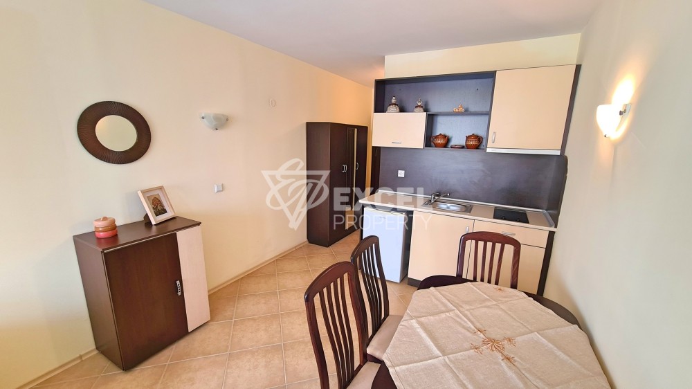 Студиото, което предлагаме за продажба се намира на 3 етаж и е с гледка към басейна. Общата му площ е 41 кв.м. и е изцяло обзаведено. Има оборудвана кухня, разтегателен диван, маса за хранене със столове, маса и столове на балкона и напълно оборудвана баня с тоалетна. В жилището има климатик, който работи както за охлаждане така и за отопление.
