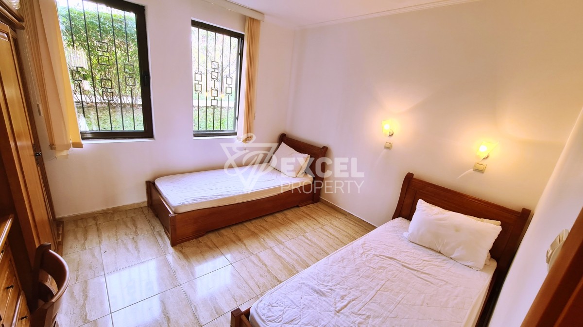 Имотът се намира на партерен етаж, с източно изложение и гледка към градината на комплекса. Разполага с площ от 91 кв.м. и се предлага напълно обзаведен. Състои се от всекидневна с удобна кухня, две спални, две бани и две тераси. В хола има разтегателен диван, ТВ шкаф с телевизор, холна маса и маса за хранене с шест стола. Кухнята е оборудвана с печка, фурна, аспиратор, хладилник и достатъчно шкафове за посуда. В спалнята ще намерите двойно легло с нощни шкафчета и гардероб. Втората спалня е оборудвана с две отделни легла с нощни шкафчета, тоалетка и гардероб. Балконът към всекидневната е достатъчно голям, за да побере маса и столове и барбекю. Втория балкон е с достъп от спалнята като пред апартамента има красиви зелени площи които можа да използвате. Апартаментът разполага с климатик, кабелна телевизия и интернет. Имотът е напълно оборудван и може да се ползва за вашите летни почивки или за отдаване под наем. Такса поддръжка 600 Евро/год.