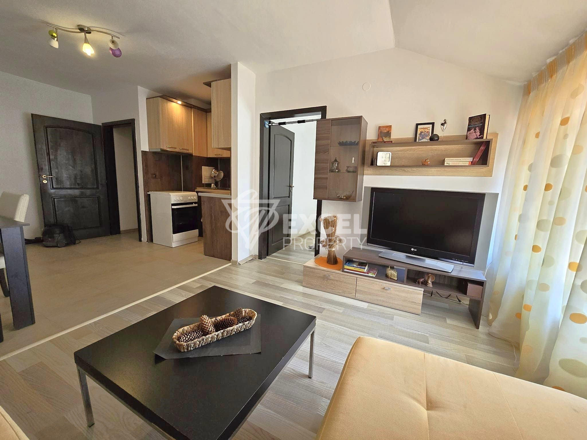 Разпределение: антре с голям гардероб, просторна баня с тоалетна, хол с кухненски бокс и преходна спалня. Няма тераса. Продава се напълно обзаведен и оборудван с всичко необходимо за живеене или отдаване под наем.