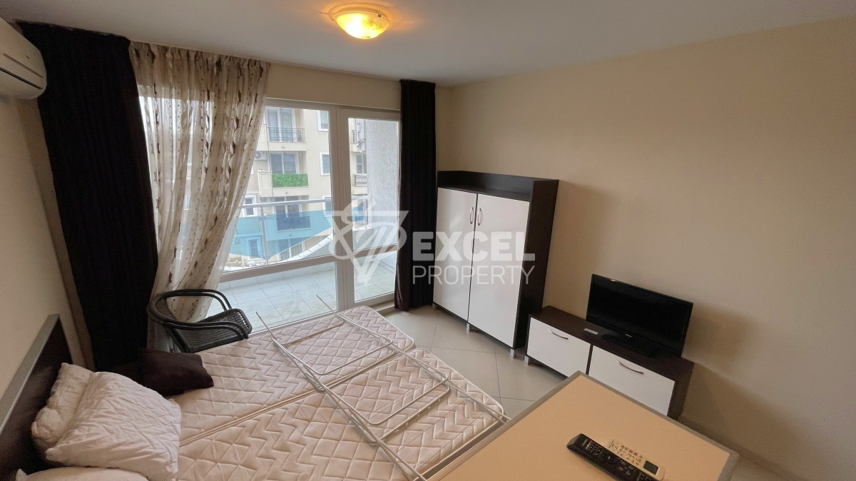 Ексел Пропърти предлага за продажба студио в комплекс Одисей. Имотът е светъл и слънчев, намира се на третия етаж и е с обща площ от 40 кв.м. Предлага се напълно обзаведено и се състои от просторна всекидневна с кухненски бокс, баня с душ кабина и балкон. Обзавеждането включва оборудван кухненски бокс с котлони, аспиратор, хладилник, маса за хранене с два стола. На разположение са още двойно легло, гардероб, комод и ТВ шкаф с телевизор. Банята е оборудвана с душ кабина, на разположение е и климатик. Терасата е с добър размер, изложението е източно и гледка към съседните комплекси и планината. Имотът предлага отлична възможност за отдаване под наем или целогодишно ползване.
