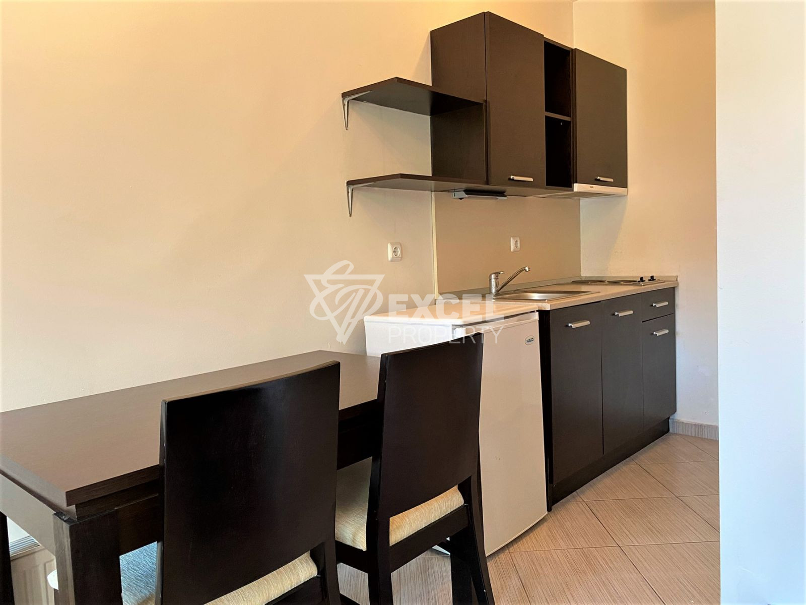 Студиото е с площ от 52 кв.м., което е разпределено между: – Коридор – Баня с душ – Стая с двойно легло, маса със столове, разтегателен диван, шкаф за телевизор – Кухненски кът с хладилник, печка, аспиратор и кухненски шкафове – Голяма тераса с изглед към басейна и планините