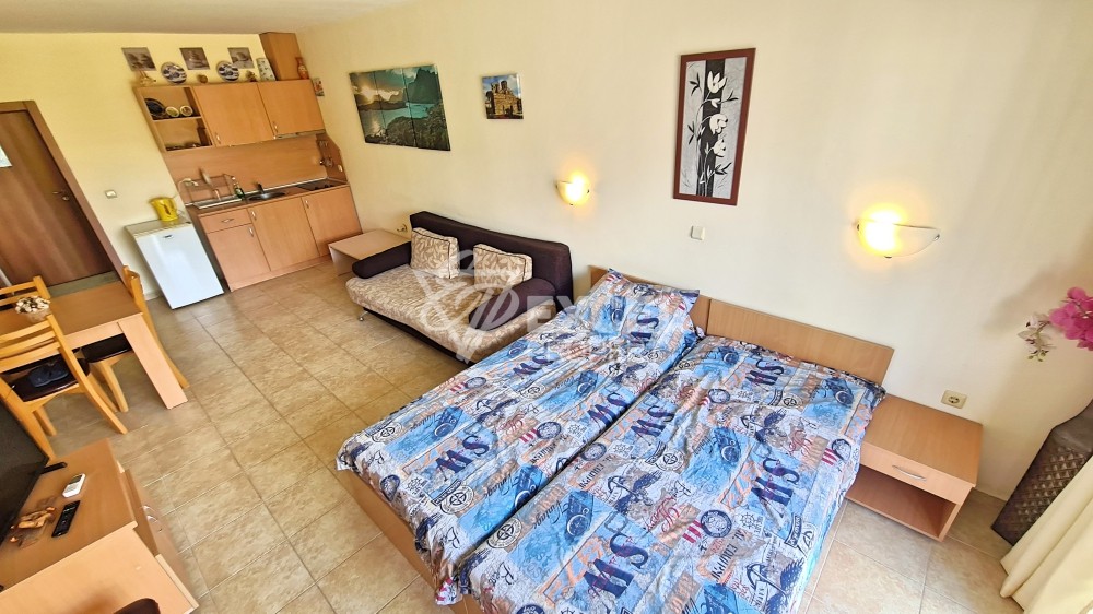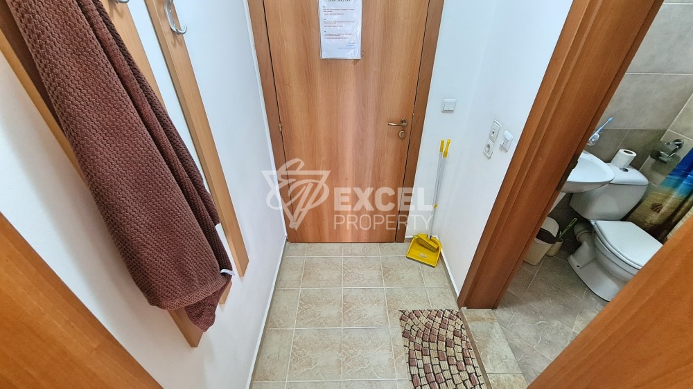 Ексел Пропърти предлага за продажба студио на третия етаж с обща площ от 42 кв.м. Имота е за продажба напълно обзаведен и разполага с входно антре, просторна всекидневна с кухненски бокс, баня и балкон. Кухнята е снабдена с котлони, аспиратор и хладилник. Ще намерите още маса за хранене с четири стола, разтегателен диван, масичка за кафе и ТВ шкаф с телевизор, двойно легло с нощи шкафчета и гардероб. Банята е напълно оборудвана на разположение е и климатик. Терасата е с много добър размер има северно изложение и гледка към съседните сгради. Имота е в отлично състояние и е готов да посрещне новите си собственици.