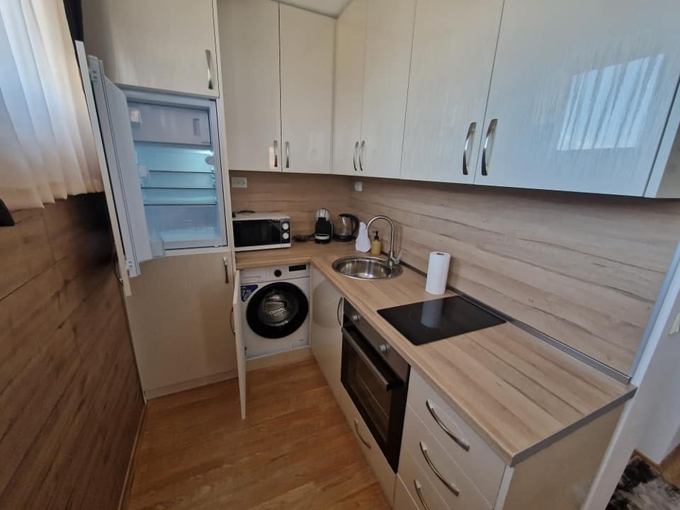 Разпределението е както следва: антре, просторна баня с тоалетна, хол с кухненски бокс и преходна спалня. Няма тераса. Продава се напълно обзаведен и оборудван с всичко необходимо за живеене или отдаване под наем.