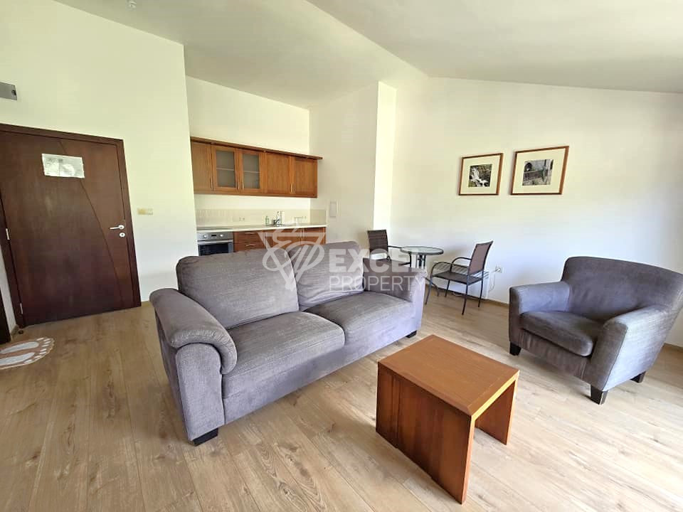 Просторно, обзаведено студио с фронтална гледка към Пирин за продажба в Green Wood, район Разлог! Целогодишно работещ Апартхотел със СПА център и басейни! Отделни партиди за ток и вода!