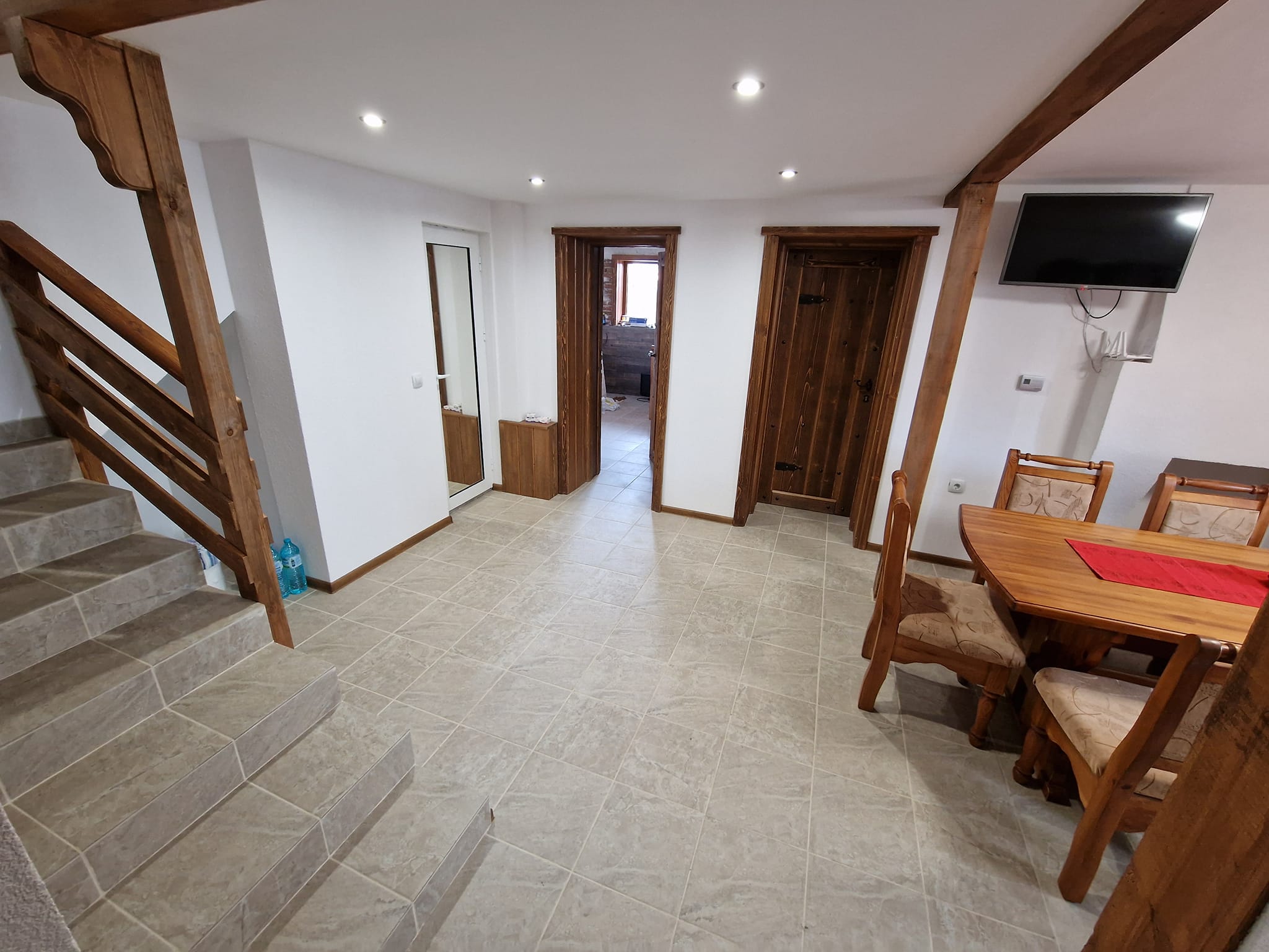 Партерен етаж: трапезария с кухненски кът, две спални, баня с тоалетна.