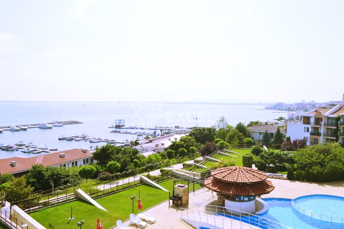 Ексел Пропърти предлага на Вашето внимание апартамент с две спални, намиращ се в уникалния комплекс Диамант- на метри от пристанището Марина Диневи, в популярния морски курорт Свети Влас. Имотът е разположен на 4-ти етаж. Разпределение на жилището: входно антре- тип коридор, две обособени спални, всяка от която има отделна баня с тоалетна, оборудвани с душ -кабина и бойлер, всяка от спалните е обзаведена с всичко необходимо за пълноценен престой, едната от стаите, се използва като детска стая или стая за гости. Спалните разполагат и с отделни тераси, предлагащи приятна гледка към Стара Планина, морския залив и частично към басейна на комплекса. Апартаментът разполага с просторна всекидневна, с кухненска част, трапезария и зона за спане с дивани. Кухнята е оборудвана с ел. котлон, хладилник, аспиратор, микровълнова, фурна и пералня, тостер и електрическа кана. Терасата е достатъчно широка, предлага страхотна гледка към пристанището и морето, както и към Стария град на Несебър. През летния период балконът се използва като зона за почивка. Комплексът се намира в Свети Влас, предлага изглед към морето, има ресторант, сезонен външен плувен басейн, бар, градина с алеи и казино, има и детска площадка, паркинг и охрана.