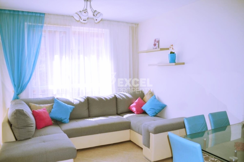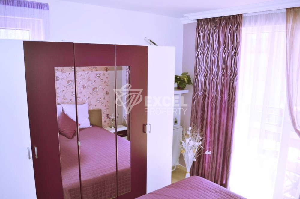 Имотът се предлага с всички необходими уреди и мебели, като може а бъде закупен с цел последващо отдаване под наем или целогодишно живеене, предлагайки добра локация, хубава площ и отлично управление на комплекса. Разпределение: отделно входно антре- коридор, оборудвана баня с тоалетна, където има душ-кабина, пералня, бойлер и всичко необходимо; хол с трапезария и кухненска част, две спални, като едната е обзаведена, като стая за гости и тераса, която е достъпна от страната н всекидневната и от страната на основната спалня. Стаята за гости разполага с два разтегателни дивана. Апартаментът е подходящ за голямо семейство ( 8 човека). Жилищен комплекс Слънце и Море се намира на 600 м от популярния плаж Какао бийч, на 300м., от автобусна спирка, на 25 км. до летище на град Бургас и на 3 км до стария Несебър. Целогодишно в Слънчев бряг функционират магазини за хранителни стоки, Супермаркети, Клиника, медицински център, поща, детска градина, а училища има в Несебър и град Свети Влас. Сградата е монолитно строителство, южно изложение. Комплексът разполага с целогодишна охрана, закрит паркинг със 7 места, затворена зона (входни чипове), паркинг за велосипеди, детска площадка, басейн за възрастни и деца с пързалка (през летния сезон), ресторант в комплекса (през летния сезон), сауна (целогодишно). Tаксата поддръжка e 15 Eврo/m2