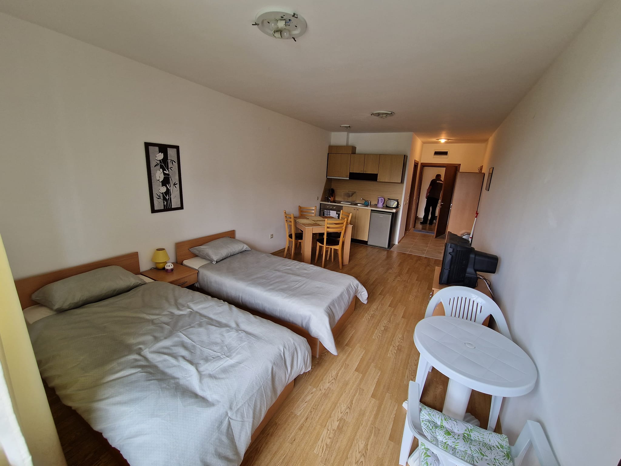 Ексел Пропърти представя на Вашетo внимание за продажба, стандартно студио с тераса в комплекс Аспен Валей. Намиращо се на 2 етаж с площ от 44 кв.м. и северно изложение с прекрасна гледка към басейна. Обзавеждането включва в кухненския бокс – вградена печка, хладилник, мивка, аспиратор, тостер и електрическа кана; дневна зона – маса с четри стола, скрин и гардероб; обзаведен спален кът с телевизор. Тоалетна с баня с вана. Отоплението е с електрически радиатори. Имотът е завършен със стени – латекс, под – ламинат и теракота и ПВЦ дограма. В сградата има асаньор.